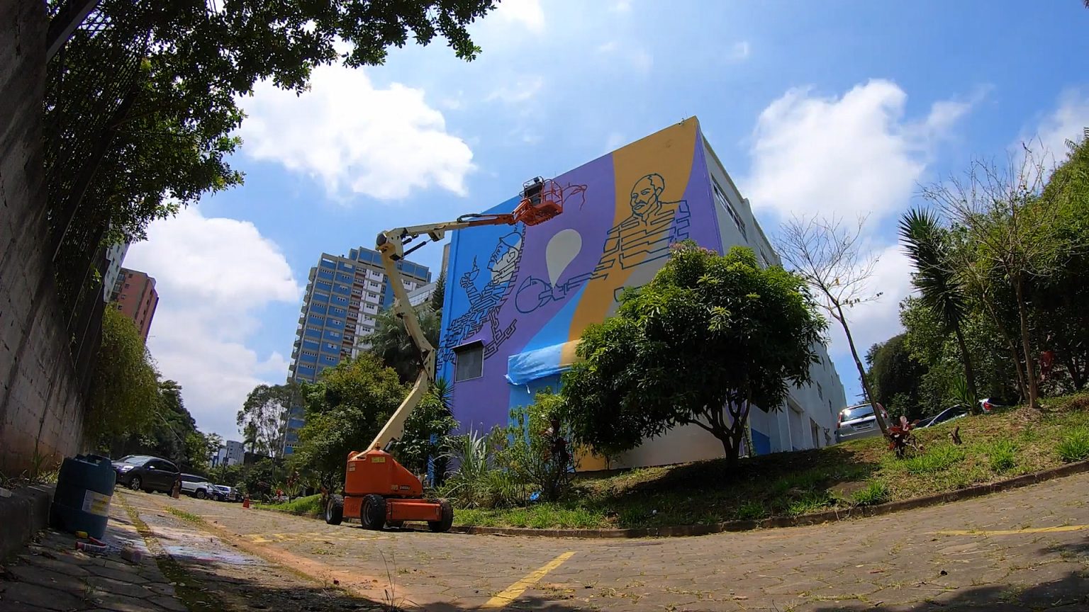 Foram usados cerca de 150 LTS de tinta para preencher todo o paredão de 130m² – sim, foram várias demãos.